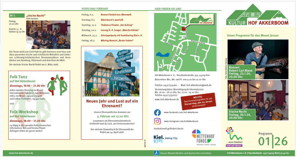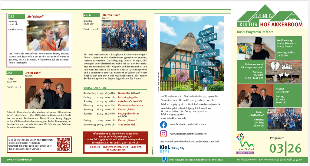 Zur Unterstützung unseres Programms dürfen wir uns über eine Förderung des Bundesverbandes der LAG freuen. Gefördert wird ein Großteil der Veranstaltungen von der Beauftragten der Bundesregierung für Kultur und Medien. Dieses erleichtert unsere Kulturarbeit enorm. Sollten auch Sie unseren Hof Akkerboom und unsere Kulturarbeit unterstützen wollen, freuen wir uns sehr über eine Spende, eine Mitgliedschaft sowie über Anmeldungen zu den nachstehenden Veranstaltungen.